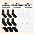 - 18 paria: 6 paria jokaista bambumalliamme – Vahva (froteepohja, hengittävä, pehmeä askel), Kevyt (erittäin hengittävä arkeen) ja Varreton (tennareihin & kuumiin päiviin).